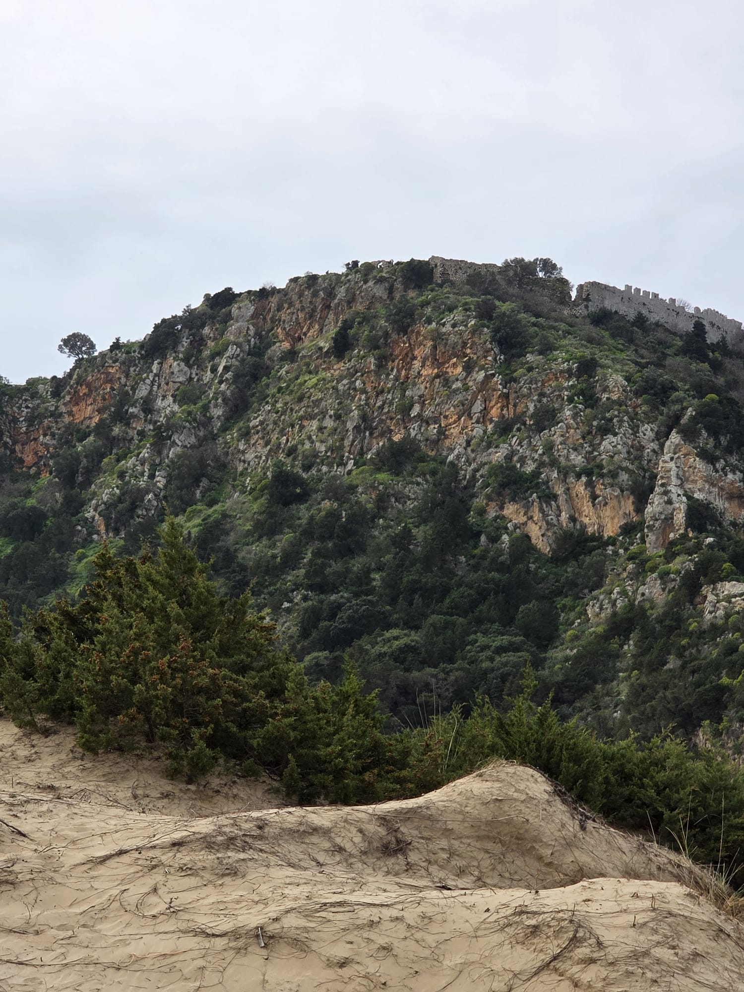 First we walk uphill to the ruins of the Paleokastro. Here we have a beautiful view over the Voidokilia bay. And we have a short break here.